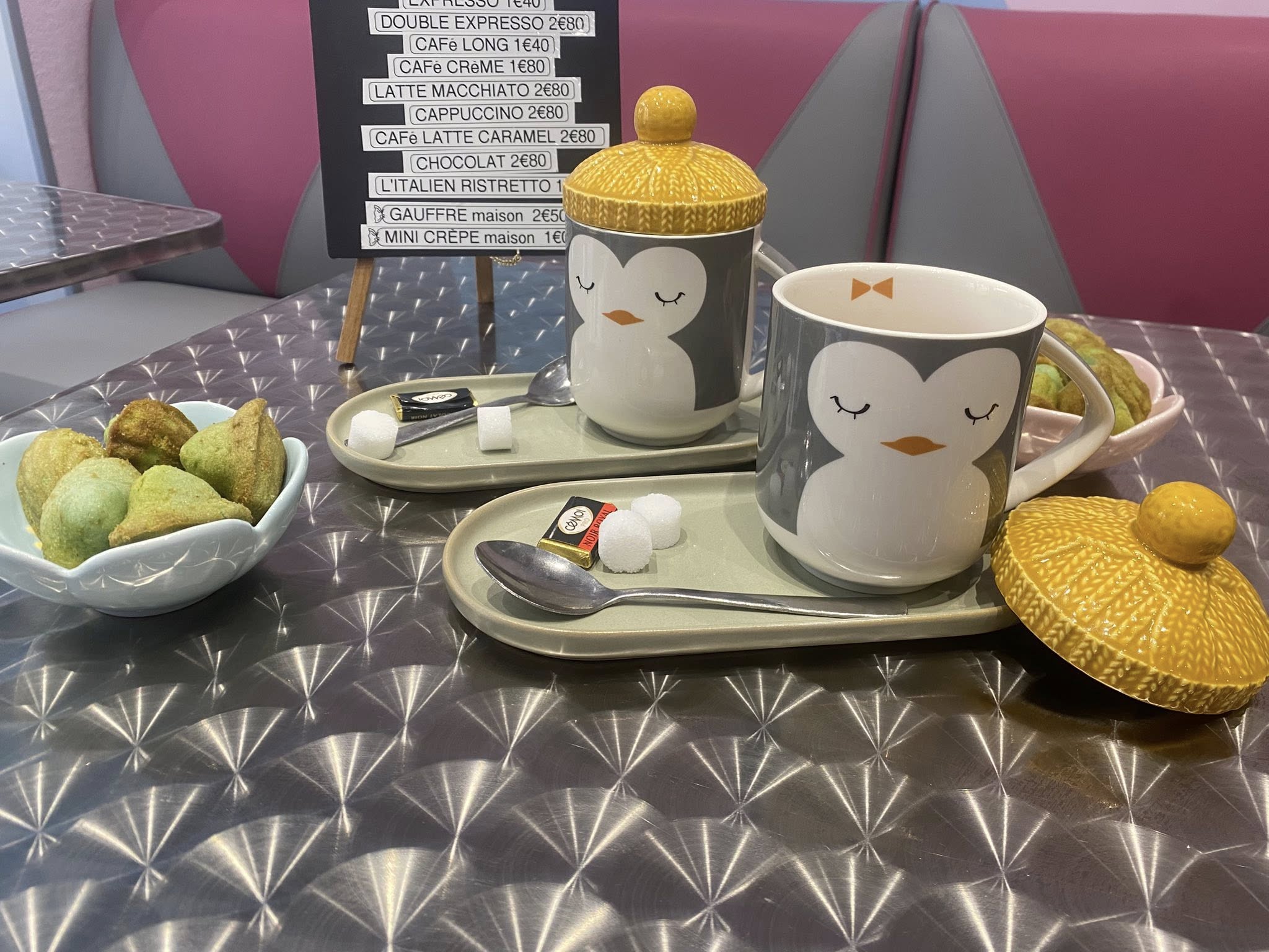 Notre salon de thé vous transporte dans une atmosphère rétro avec ses fauteuils confortables, ses nappes à carreaux et sa décoration soigneusement sélectionnée pour évoquer les années 50-60.